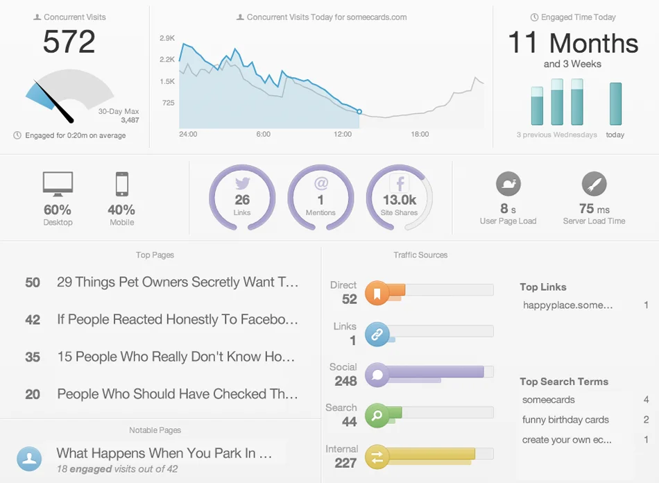 از ویژگی های این سایت می توان به داشبورد بسیار جذاب و کامل و همچنین برخورداری از ابزارهای تحلیلی کافی برای بررسی کامل یک سایت اشاره کرد. یکی از قابلیت های پیشرفته این ابزار ، امکان بررسی دقیق افرار آنلاین در سایت و همچنین بررسی لحظه ای عملکرد آن ها بر روی سایت شما (Real-Time Analytics) می باشد.