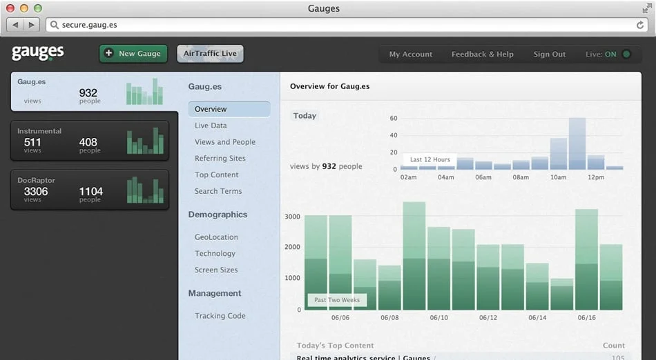 یکی دیگر از منابع جایگرین مناسب برای گوگل آنالیتیکس ، سایت Gauges می باشد که بر روی داده ها و اطلاعات مهم به صورت real time تمرکز می کند. رابط کاربری این سایت ساده بوده و در مجموع می توان گفت که ویژگی های آن بسیار مشابه با گوگل آنالیتیکس می باشد.