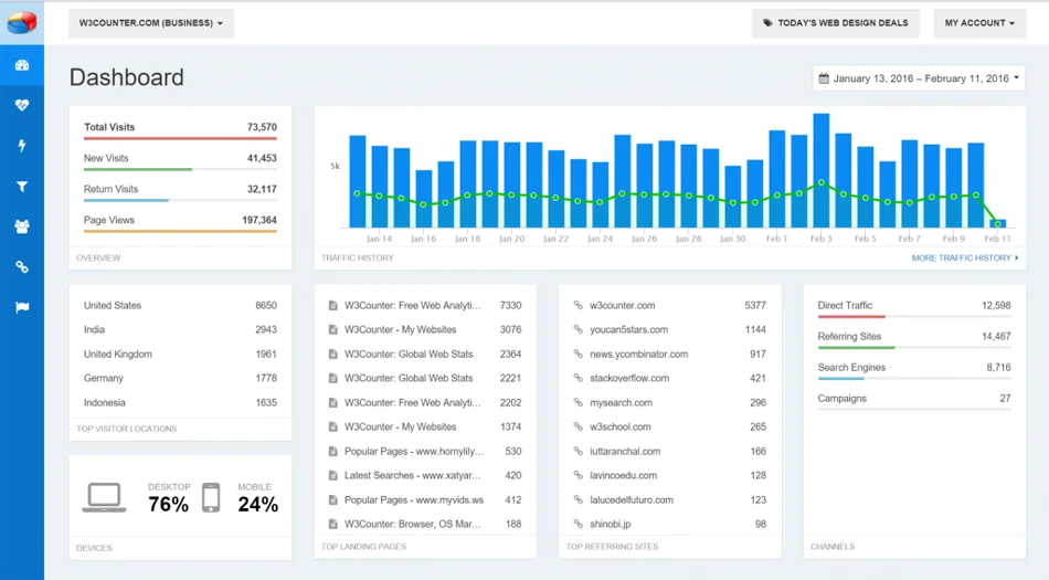 یکی دیگر از سایتهایی که می توانید از آن به عنوان جایگزین گوگل آنالیتیکس استفاده کنید ، وبسایت W3Counter می باشد. قابلیت های متعدد این سایت و رایگان بودن آن سبب شهرت آن در میان طراحان و مدیران وبسایت ها شده است. از ابزارهای تحلیل این سایت می توان به صفحات پربازدید سایت ، تعداد بازدیدکنندگان ، منابع ورودی وبسایت و ترافیک سایت اشاره کرد.